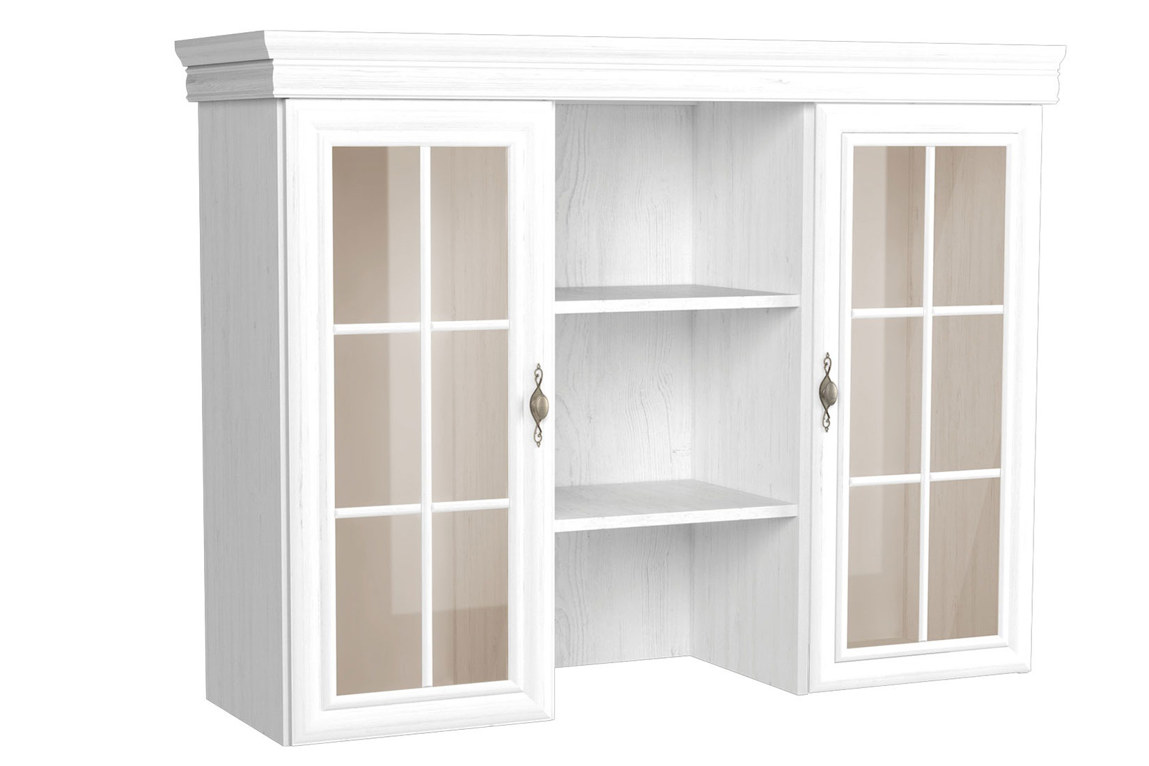 Расширение Kora KN4три открытые полки и три скрытые за двойными дверцами со стекломв сочетании с КК5 мы получим сервантламинированная плита, устойчивая к повреждениямметаллические ручки золотистого цвета