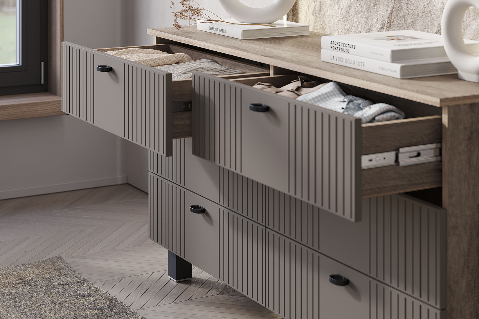 Комод Олива КМ-04 — это элегантное и функциональное решение для любого интерьера. Коллекция представлена в трендовых пудровых оттенках. Фрезеровка на фасадах создает интересные текстурные контрасты и визуальные акценты. Кроме того, этот элемент декора также помогает скрыть мелкие загрязнения, что упрощает уход за мебелью. Черные металлические накладные ручки и петли с доводчиками обеспечивают удобство в использовании. Особенности: - Материал корпуса: ЛДСП - Материал фасада: МДФ - Толщина кромки: 0.45 мм - Ручка: металлическая, черная, 32 мм - Опоры: квадратные черного цвета, подпятник регулируемый - Шариковые направляющие - Максимальная нагрузка на ящик - 5 кг