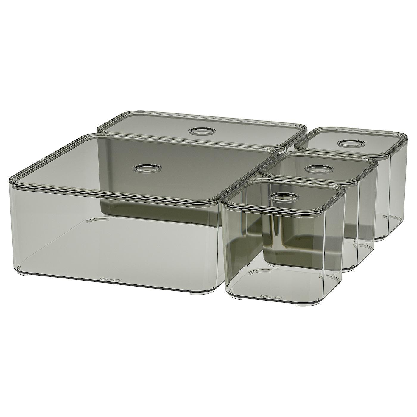 В комплект входят: 1 контейнер (20,6×20,6×8,7 см), 1 контейнер (20,1×10,3×8,7 см) и 3 контейнера (9,8×9,8×8,7 см).