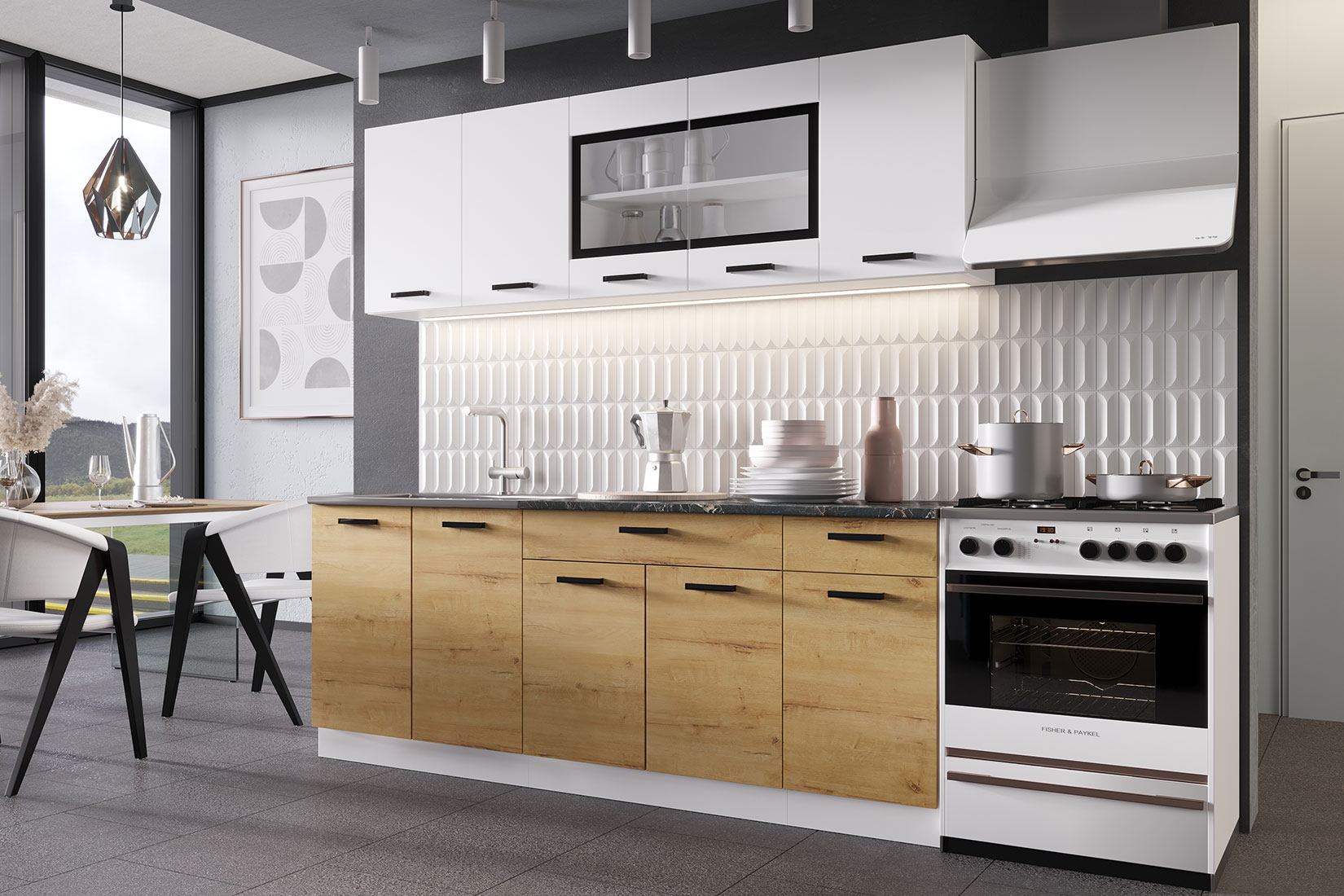 Брауни кухня модульная Белый гладкий/Дуб Вотан - практичный комплект в современном стиле! Несмотря на простоту дизайна модель объединила в себе самое необходимое для комфортного использования. Шкафы и столы оснащены необходимым количеством полок и отделений, где Вы сможете хранить бытовые принадлежности. Кухонный гарнитур представлен в цвете Дуб Вотан/Белый гладкий. Кухня Брауни станет отличным украшением интерьера!