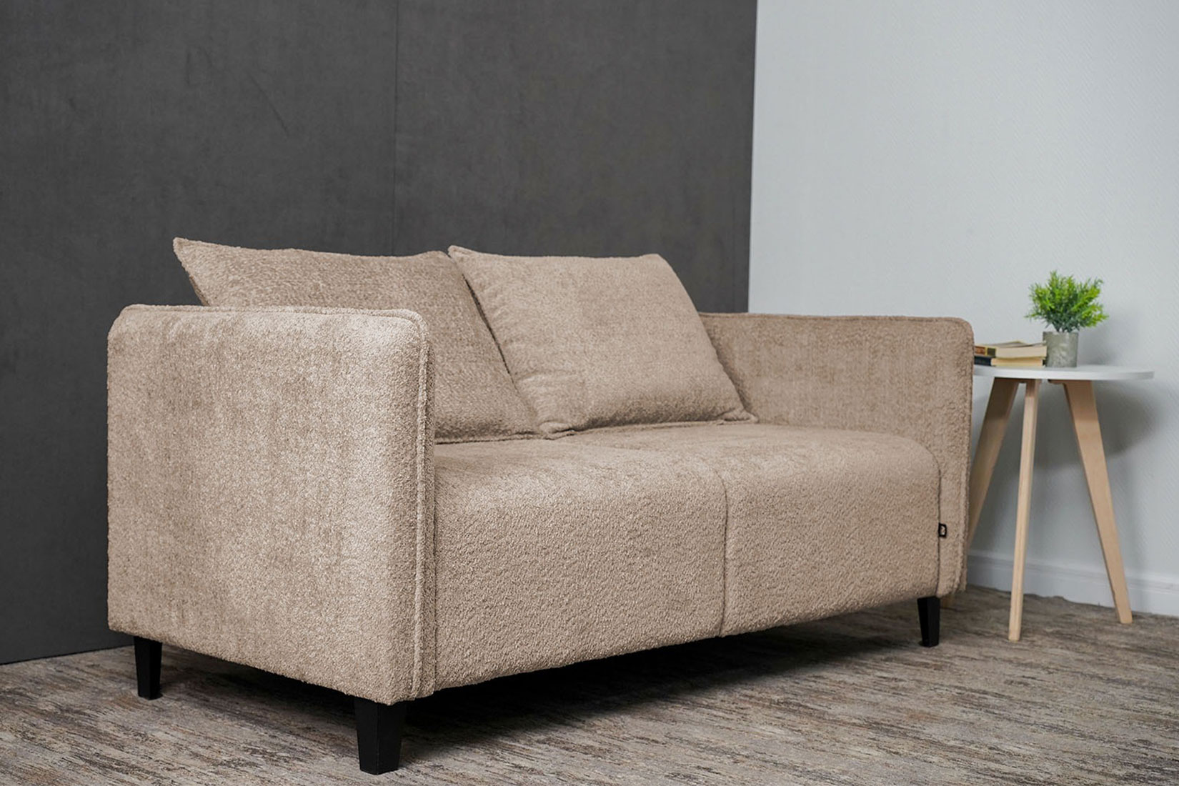 Обивка выполнена из трендовой ткани букле в кофейном цвете — она приятна на ощупь, отличается износостойкостью до 60 000 циклов и имеет водоотталкивающее покрытие с эффектом «антикоготь», что делает диван практичным в повседневном использовании и устойчивым к загрязнениям.