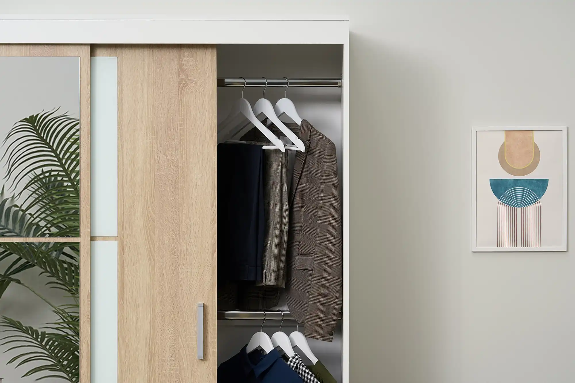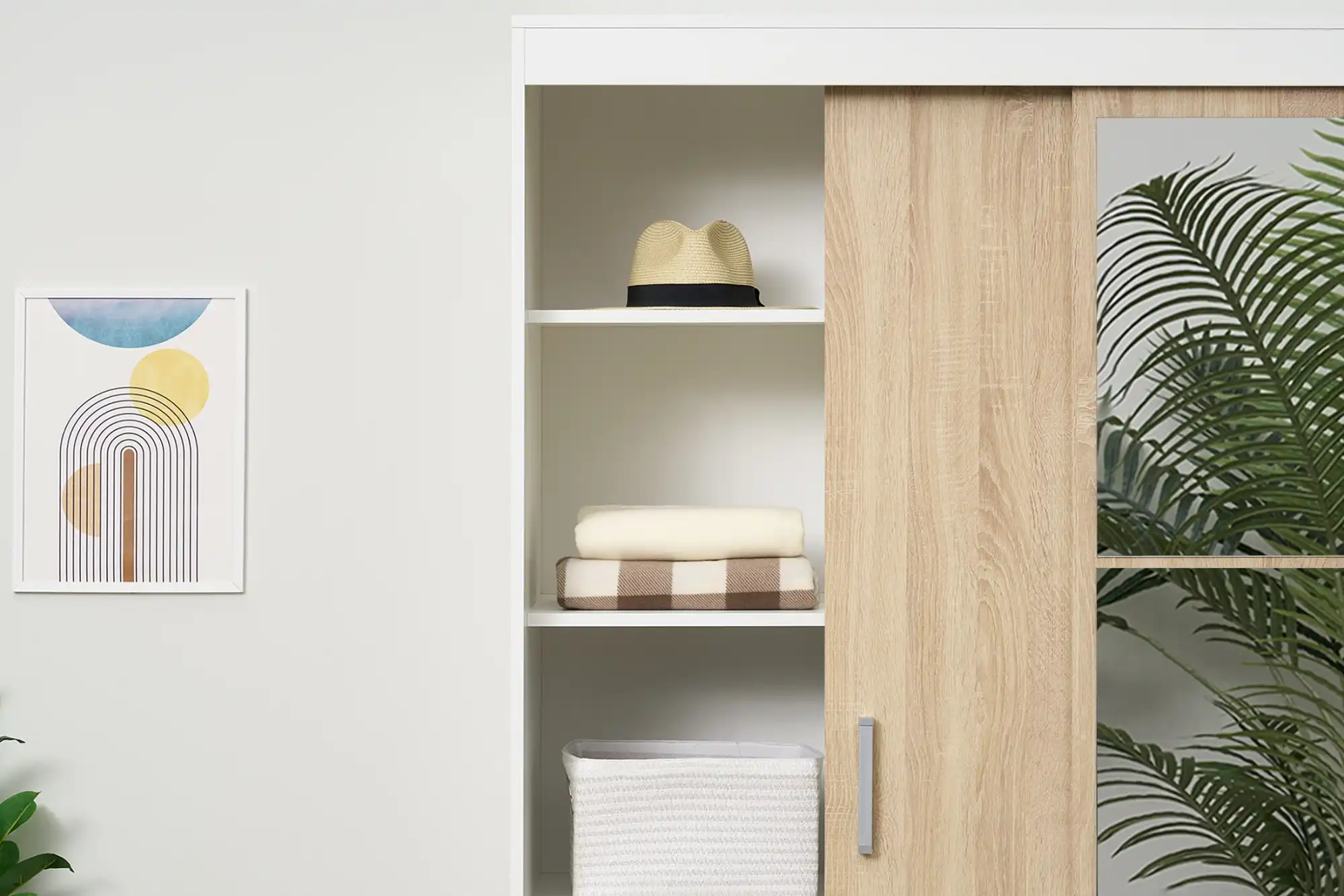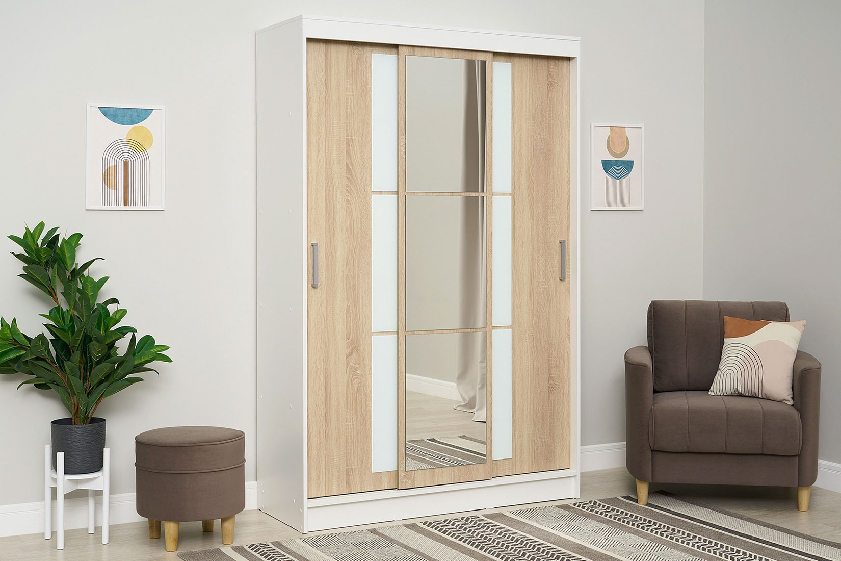 Трёхдверный шкаф-купе ШКК-03 представляет собой сочетание практичности и функциональности. Это оптимальный вариант с точки зрения эргономики пространства. Раздвижные створки снабжены удобными ручками, центральная створка полностью декорирована тремя зеркалами с еврокромкой, которое создаёт иллюзию расширенного пространства, а на боковые створки наклеены по 3 стекла с лакобелью. Внутри с одной стороны находятся пять просторных полок для хранения вещей и постельного белья, с другой стороны – вместительная зона хранения с двумя горизонтальными хромированными штангами для одежды на вешалках. Сборка универсальная. Максимальная нагрузка на полку - 10 кг, на штангу - 10 кг. Красивое и практичное решение по лучшей цене — это шкаф-купе Денвер ШКК-03.