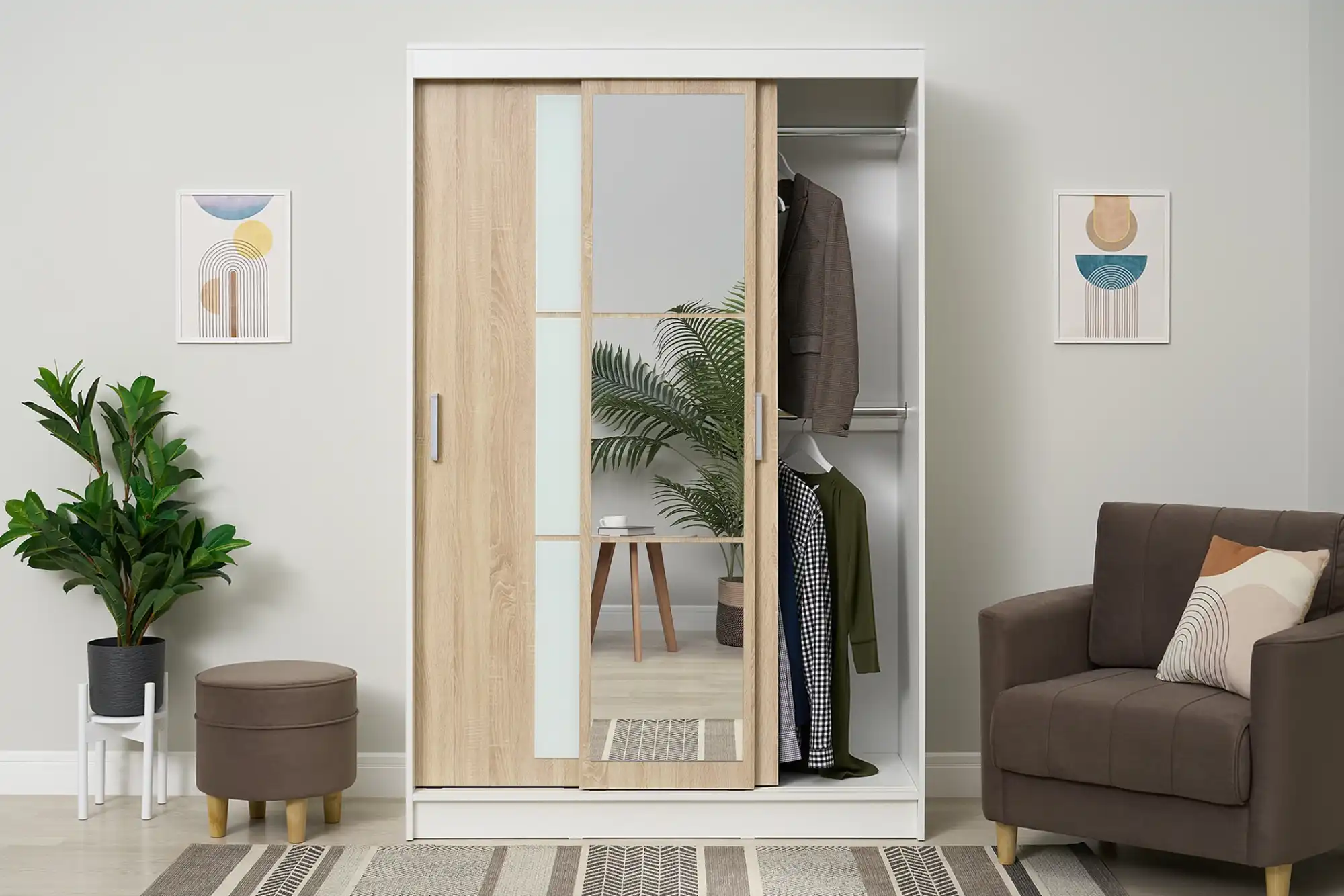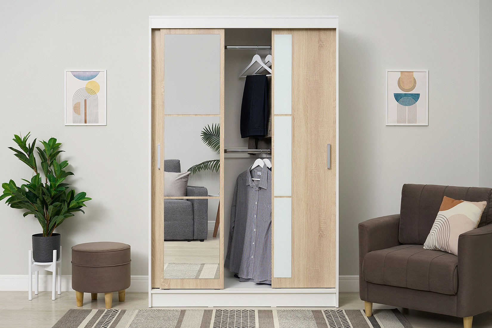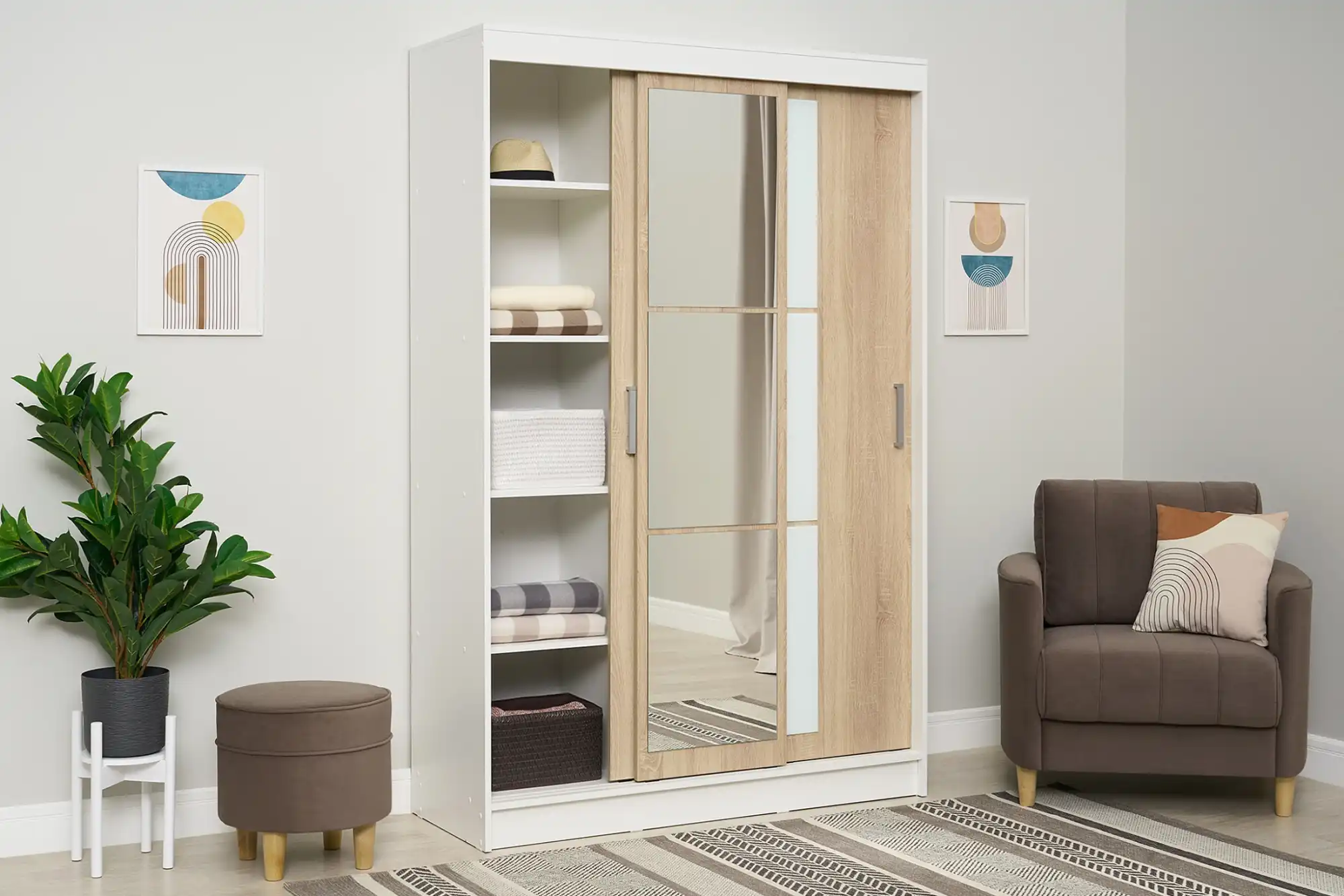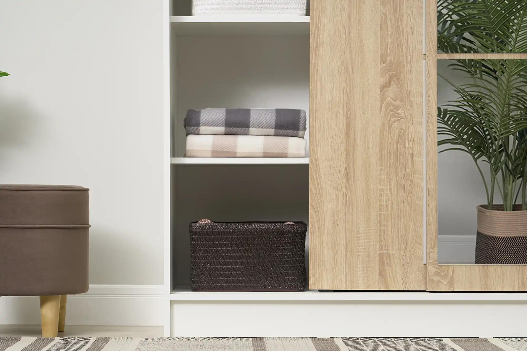Трёхдверный шкаф-купе ШКК-03 представляет собой сочетание практичности и функциональности. Это оптимальный вариант с точки зрения эргономики пространства. Раздвижные створки снабжены удобными ручками, центральная створка полностью декорирована тремя зеркалами с еврокромкой, которое создаёт иллюзию расширенного пространства, а на боковые створки наклеены по 3 стекла с лакобелью. Внутри с одной стороны находятся пять просторных полок для хранения вещей и постельного белья, с другой стороны – вместительная зона хранения с двумя горизонтальными хромированными штангами для одежды на вешалках. Сборка универсальная. Максимальная нагрузка на полку - 10 кг, на штангу - 10 кг. Красивое и практичное решение по лучшей цене — это шкаф-купе Денвер ШКК-03.