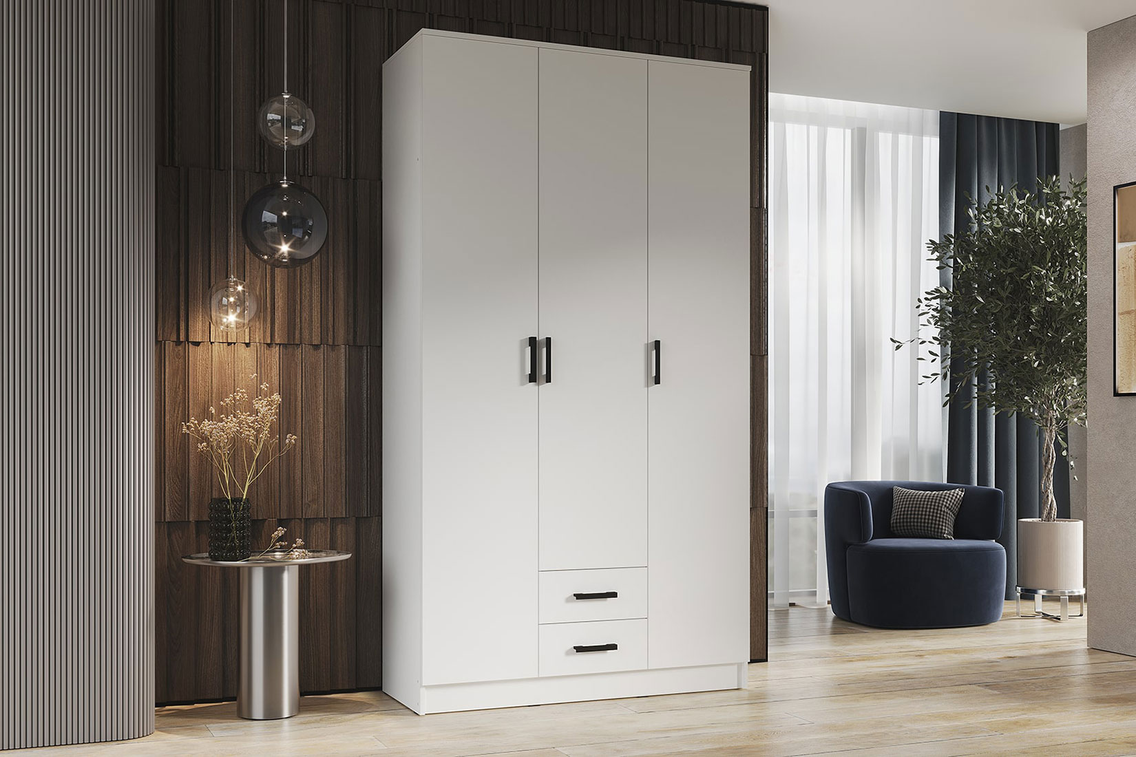 Два выдвижных ящика обеспечивают дополнительное пространство для хранения мелких предметов, таких как аксессуары, украшения или косметика. Материал корпуса и фасадов - ЛДСП, что гарантирует прочность и долговечность изделия. Фурнитура выполнена из пластика, что делает ее легкой и безопасной для использования. Наполнение шкафа: Полки, штанга, ящики.