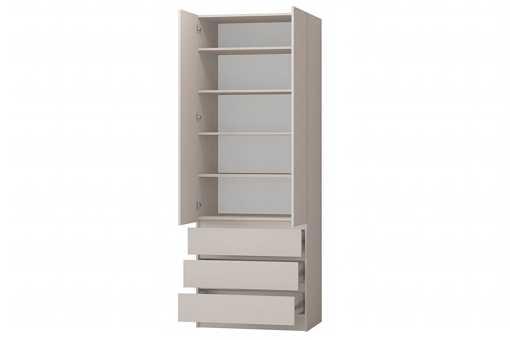 Ящики с использованием механизма полного выдвижения и плавного закрывания, дно ящика выполнено из ЛДВП в цвет корпуса