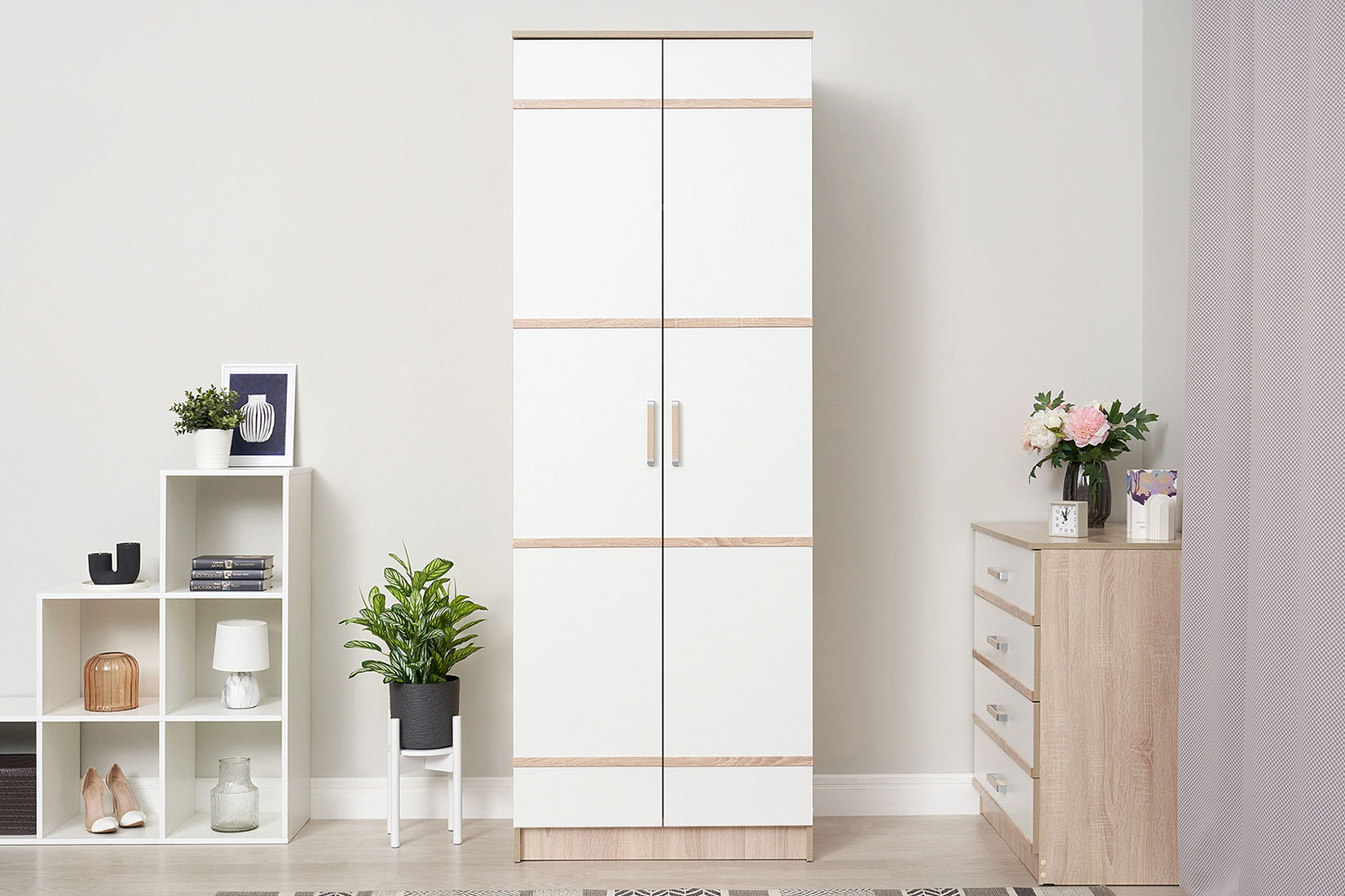 Двухдверный распашной шкаф Сакура - практичное решение в том случае, если Вам необходимо организовать хранение в малогабаритной спальне или прихожей. Корпус выполнен в декоре 'дуб сонома', фасады - в белом с геометрическими древесными вставками. Наполнение шкафа представлено комплектом полок и продольной штангой, которые Вы можете установить на удобной для Вас высоте. Благодаря этому места хватит для одежды на плечиках, вещей в сложенном виде, обуви и т.д.